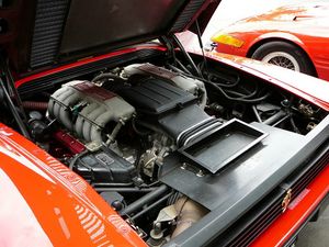 The Testarossa sports a 4.9 litre (4,943 cubic centimetres/302 cubic inches) Ferrari Colombo Flat-12 engine mounted at 180 degree mid, longitudinally.[4][8] Each cylinder has four valves, with forty-eight valves total, lubricated via a dry sump system, and a compression ratio of 9.20:1.[8][4] These combine to provide a maximum torque of 490 newton metres (361 ft·lbf) at 4500 revolutions per minute and a maximum power of 291 kilowatts (396 PS; 390 hp) at 6300 revolutions per minute.[1][4][9] Early U.S. versions of the car had the same engine, but slightly less horsepower with only 283 kW (385 PS; 380 hp).[2][7][9]